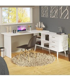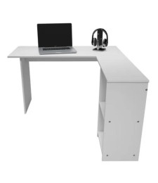 Uno de sus elementos distintivos es la repisa flotante elevada, ideal para colocar libros, portátiles, decoraciones o accesorios de uso frecuente, al mismo tiempo que libera superficie en el área de trabajo. En el costado izquierdo, el escritorio incluye un módulo de repisas laterales abiertas que funciona como soporte estructural y sistema de almacenaje integrado.