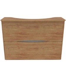 El diseño destaca por su frente en L invertida, donde el panel blanco frontal —ligeramente elevado— funciona como un punto visual diferenciador, rompiendo con la linealidad del acabado tipo madera. Esta geometría genera contraste y profundidad, haciendo que el módulo sea atractivo desde cualquier ángulo sin caer en lo excesivamente ornamental.